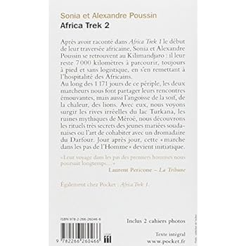 Après avoir raconté dans Africa Trek 1 le début de leur traversée africaine, Sonia et Alexandre Poussin se retrouvent au Kilimandjaro : il leur reste 7 000 kilomètres à parcourir, toujours à pied et sans logistique, en s'en remettant à l'hospitalité des Africains. Au long des 1 171 jours de ce périple, les deux marcheurs nous font partager leurs rencontres émouvantes, mais aussi l'angoisse de la soif, de la chaleur, des lions. Avec eux, nous voyons surgir les rives irréelles du lac Turkana, les ruines mythiques de Méroé, nous découvrons les rituels très secrets des jeunes mariées soudanaises ou l'art de cohabiter avec un dromadaire du Darfour. Jour après jour, cette " marche dans les pas de l'Homme " devient initiatique. " Leur voyage dans les pas des premiers hommes nous poursuit longtemps... " Laurent Pericone – La TribuneInclus 2 cahiers photos